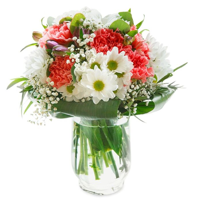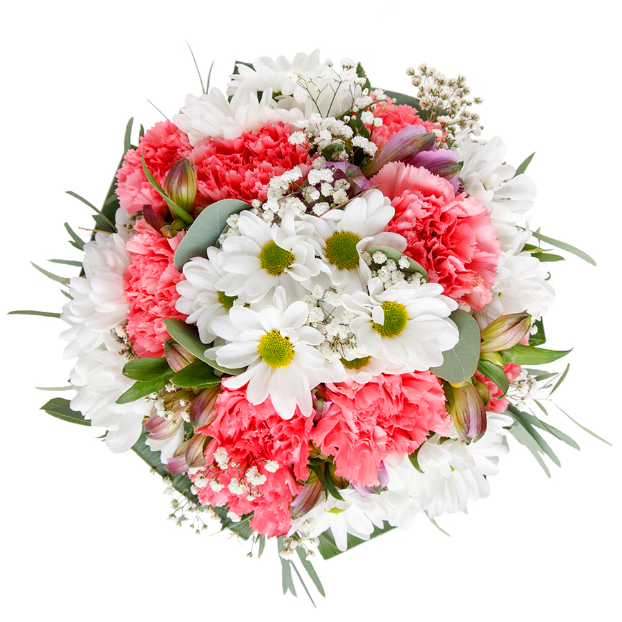 Celebrate special moments with our elegant white and pink seasonal bouquet. This beautiful arrangement features a harmonious blend of snow-white chrysanthemums, delicate gypsophila, soft light pink carnations, and lush aspidistra leaves, all expertly arranged to create a unique and sophisticated floral display.
